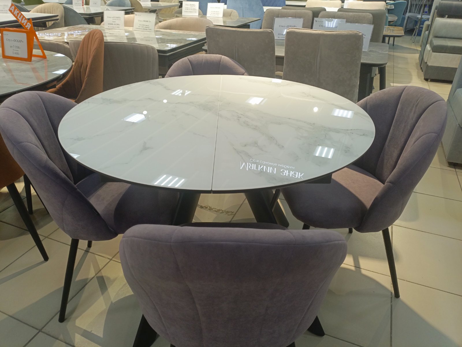 (Размер стандарт D1000(+400, бабочка) Форма круг/Верх стекло оптивайт с ф/п белый мрамор/Столешница МДФ в пленке черный кварц/рама металл черная/Подстолье метал. овальное черное)