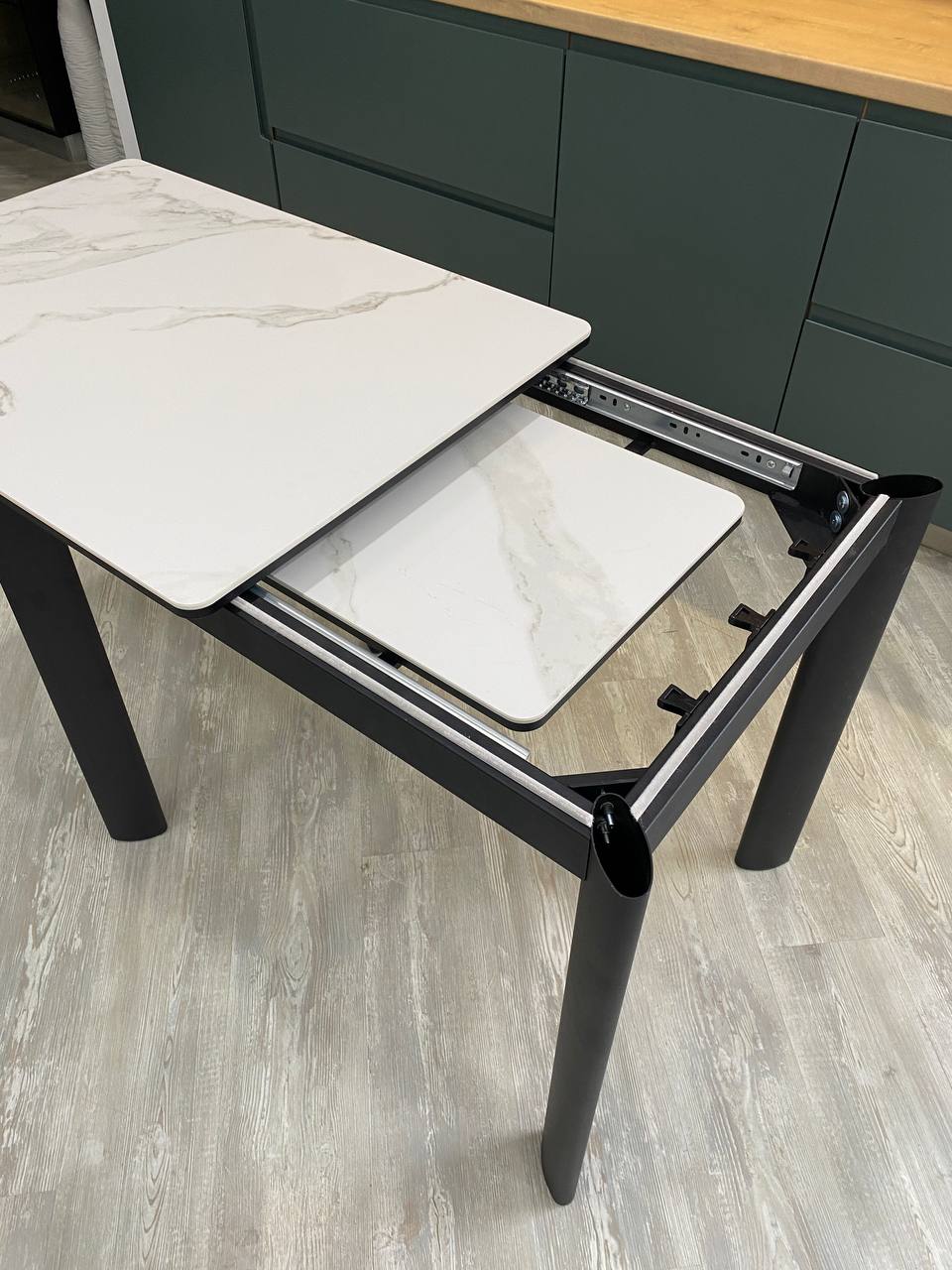 С помощью ручного механизма его можно разложить до 130 см, вставка хранится внутри стола.